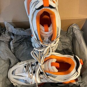 These Balenciaga athletic shoes boast a bold white and orange color scheme, featuring a chunky silhouette that aligns with the latest sneaker trends. The multi-layered construction of mesh and synthetic materials ensures breathability and durability, while the thick, textured sole provides excellent traction. Distinctive track-inspired elements and a complex lacing system complete the modern, sporty look.