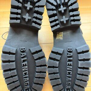 Authentic Balenciaga Trooper lace-up combat boots in black calfskin leather. Features the distinctive square toe, raised welt detailing, and chunky lug sole. A standout silhouette from Balenciaga’s modern runway collections.