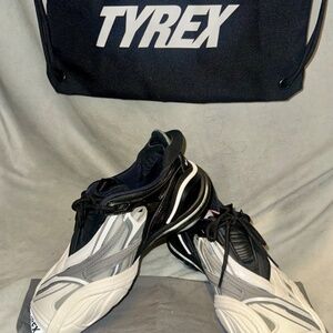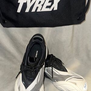 Black, White and Grey Men's Low Profile Sneaker/Trainer. Euro size 37 US size 7. Light, comfortable, and sleek low profile trainer. Rubber, Mesh,and Leather accents. Individual Balenciaga duster/shoe bag for each shoe and single Tyrex drawstring backpack included.