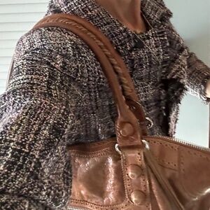 Added photos to show on shoulder- I am average size wearing a pretty thick tweed blazer, last two photos are other weekenders for size