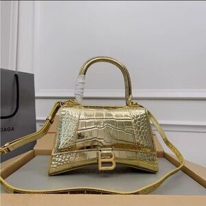 Stylish gold croc embossed handbag with a top handle and detachable strap. Features a bold 'B' logo on the front.