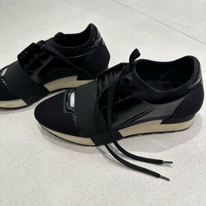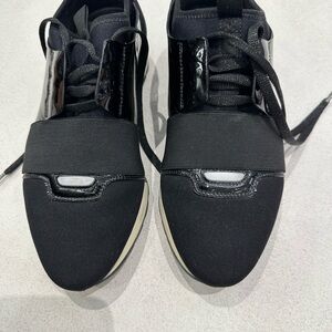 Preowned in good condition, no box. Size 7. Blk charcoal and textile. Discoloration on the white rubber ( please see the pictures).