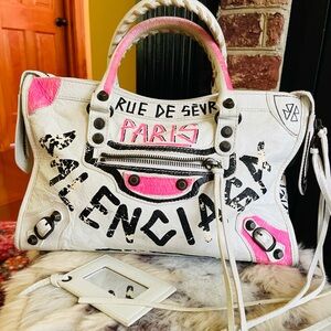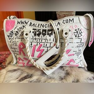 Balenciaga white agneau distressed lambskin graffiti classic handbag