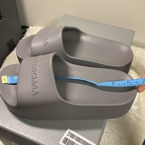 Super amazing pair of balenciaga chunky slides in the perfect color. Get ready for warm weather, slides are brand new with small defects please see pictures. I’m normally a 6.5/7 and these fit me perfectly just for reference. Floor sample in box with dust bags