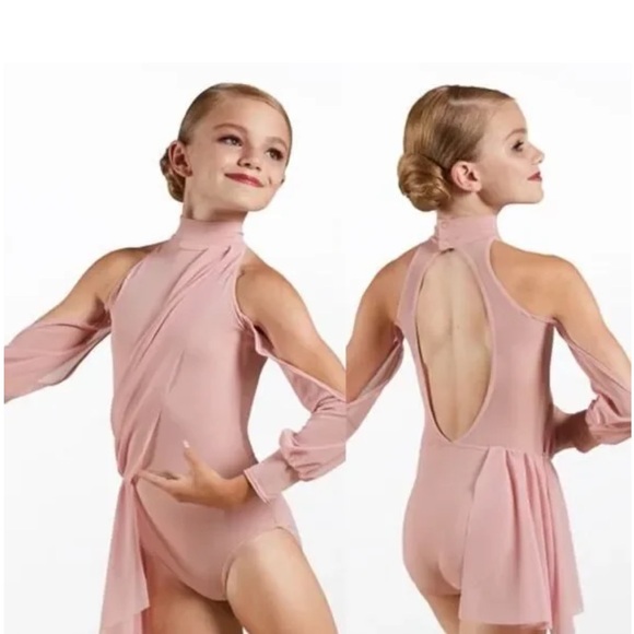 Chic blush pink dance costume by Balera. Features open back and elegant sleeves. Perfect for performances.