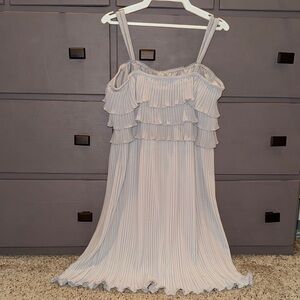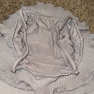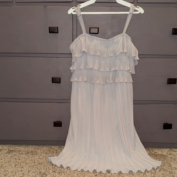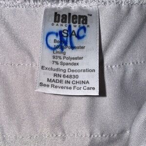 Elegant light gray dress style dance costume by Balera with ruffled layers, adjustable straps, and leotard base. I have 2 of these costumes and they were both worn once.