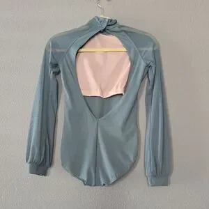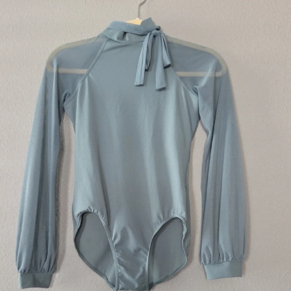 Stylish long sleeve leotard. Features a tie neck design. Perfect for dance or performance.