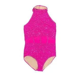 Dazzling pink halter bodysuit with sparkling details. Perfect for jazz, acro, tap dance performances.