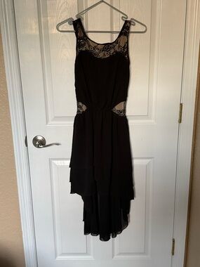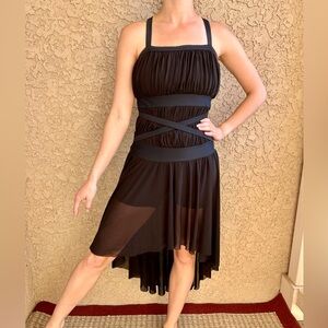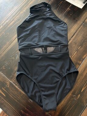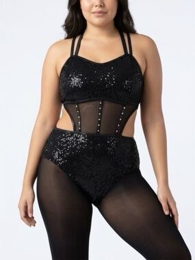 Power mesh waist with cage strap details is unlined