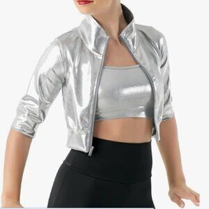 Balera Dancewear, Metallic Dance Jacket, Silver Performance Jacket, Zip-Up Cropped Jacket, Cheerleading Outfit, Dance Team Costume, Stage Wear, Dance Competition Outfit, Trendy Dance Apparel, Athletic Performance Wear