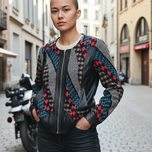 VINTAGE Bali Houndstooth Mix Print Colorful Vegan Leather Trim Zip Front Jacket.