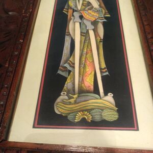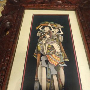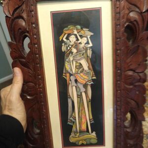 Bali Painting Drawing Carved Wood Frame Elongated People Fruit Nice!.
