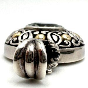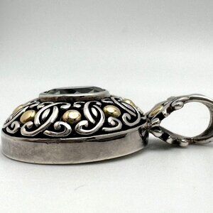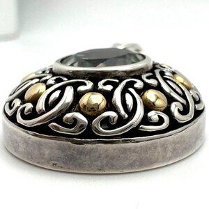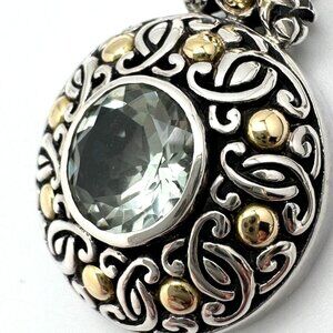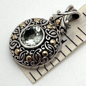 This stunning Bali pendant features an elegant round prasiolite gemstone, encased in intricate sterling silver scrollwork, accented with 18K yellow gold. The craftsmanship highlights the beauty of the gemstone, making it a striking accessory for any jewelry collection. A timeless piece that exudes sophistication and style.