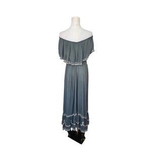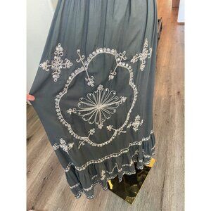 • indie free flowing flowy rayon made in Indonesia off the shoulder long maxi length embroidered sequins sparkly fairy hippie 70s boho vacay resort gypsy beach resort beachy