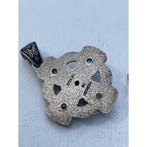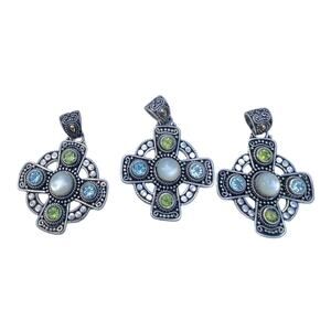 Get ready to rock your necklace game with this killer cross pendant! Made with shiny sterling silver and a pop of 18k yellow gold, it features two peridot and two blue topaz gems, plus a mother of pearl stone. And guess what? There's four of them up for grabs.