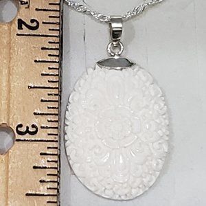 This beautiful carved bone pendant was made by the Indonesian people in the Bali style that they are excellent at producing. It hangs from a 20 inch 925 Sterling Silver sparkle chain and will attract much attention!