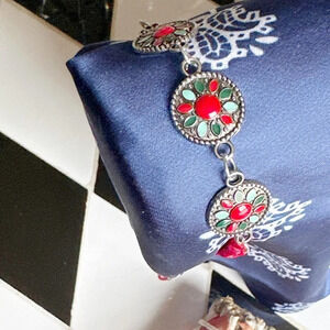 Bali silver coral jade and turquoise mandala red cord adjustable bracelet