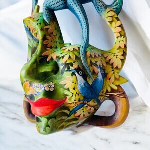 Balinese Hand Carved Wooden Blue Lizard Reptile & Birds Rainforest Goddess Mask