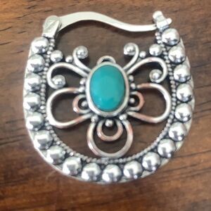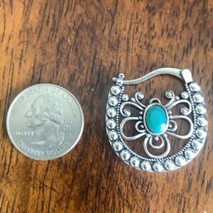 TAGS: turquoise cabochon earrings silver tone butterfly filigree hoops bali style jewelry artisan look detailed metalwork openwork lightweight versatile #turquoiseearrings #filigreeearrings #balistyle
