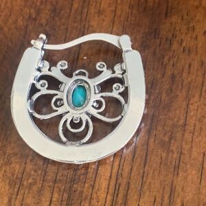 Balinese style openwork shapes these silver tone hoops, each one centered with a turquoise cabochon.