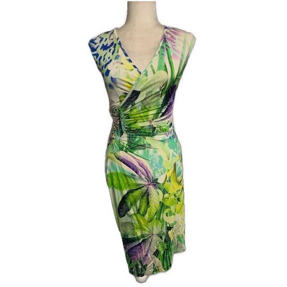 Balizza Green White Purple Blue Floral Rhinestone V Neck Tank Mini Dress Xs