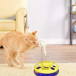 Product descriptionKeep your cat busy for hours with this fun ball track cat toy with 12" Mouse swatter. Features a two-toned plastic track with a ball with a bell inside and a furry, realistic White mouse on a metal spring swatter. This is a neat 2 in 1 toy for all kittens and cats to enjoy. The slotted plastic base has a ball that easily glides so kitties can Bat it around. The ball is contained within the base. The Faux furry Mouse sits on a flexible spring wand for batting that attaches to the plastic ball.