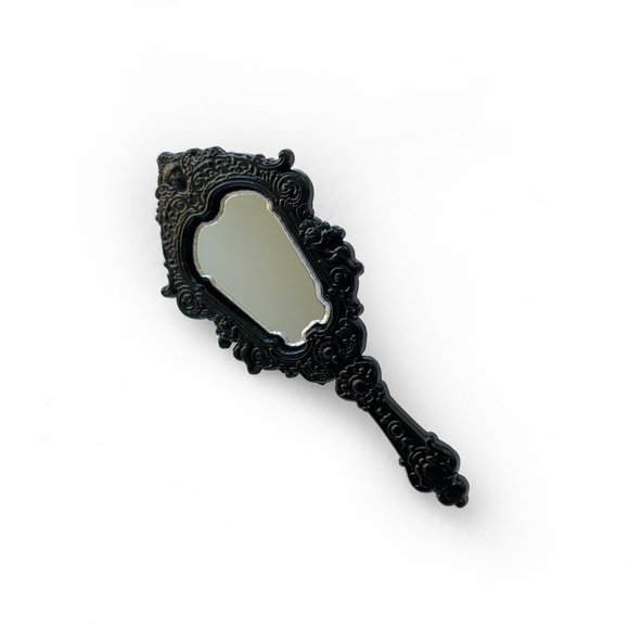 Black victorian hand-mirror enamel pin by Ball & Chain Co. Intricate design, mirror insert, deluxe silver-tone clutch closure.