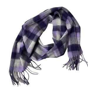 This listing is for a Ballantrae 100% Lambswool Check Scarf. Purple/Gray. Fringe. Approx 10in x 65in.