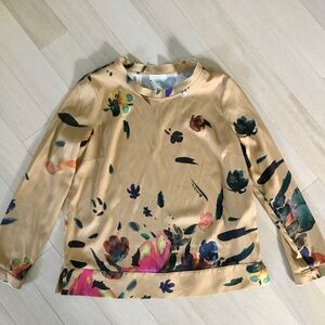 Beige silk top sweater floral design loose flattering silhouette long sleeves NWT