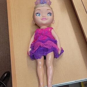 Ballerina Dreamer doll is approximately 18" tall. You push on her tiara and she will kick up her leg. She takes batteries but the compartment is a little dirty so we don't know if she works. A good cleaning in the comparent would most likely work. That is why we are selling her as-is. The cute wonder woman doll makes a nice companion for her. Her boots are removable.