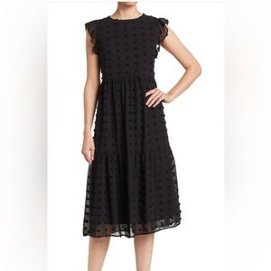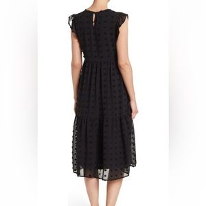 Clip dots add allover texture to this modest midi dress with a tiered hem and fluttery sleeves.
