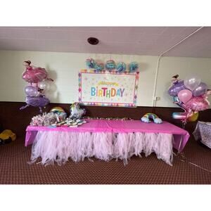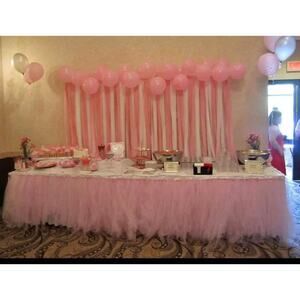 Pink tulle tutu table skirt. Per original source, it’s 16 ft.
