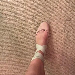 Light pink ballet flats with beige ribbons to tie up the leg. They have been worn twice. Super comfortable.