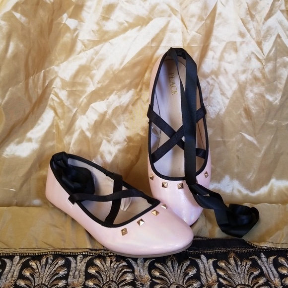 NEVER WORN!! A pearl pink, black ribbon lace up. New without tags. Fits a womans size 6 or a girl size 4