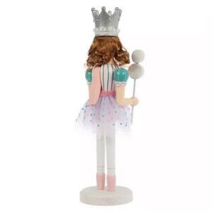 Add a sweet touch to your seasonal display by decorating your home with this Candy Fairy Princess Nutcracker. This fairy princess is wearing a pastel dress with a polka dot skirt and striped blouse. It is embellished with woven trim and sheer ribbons on the front tied into bows. She stands on a round base coated in iridescent glitter and holds a peppermint wand in her hand. With a silver crown, curly brown hair, and a beautiful face, this proper princess is ready to celebrate Christmas with you!