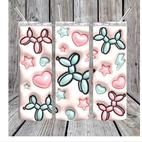 Charming tumbler featuring a playful balloon animal pattern in pink and blue. Perfect for adding fun to any drink time.20 oz stainless steel tumbler
