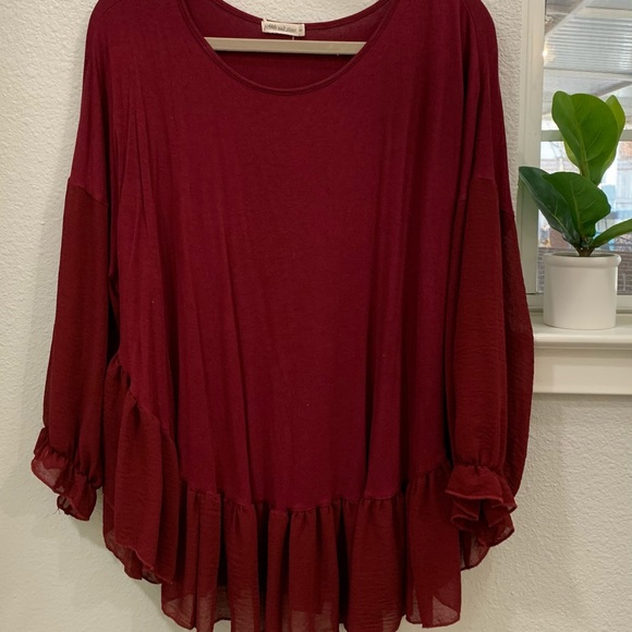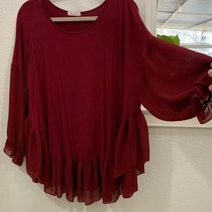 Wine color, sheer ballon sleeves and ruffle hem. Super fun top with skinny jeans!! Size medium but fits more like a large bc it’s flowy. Worn once. Smoke free home!