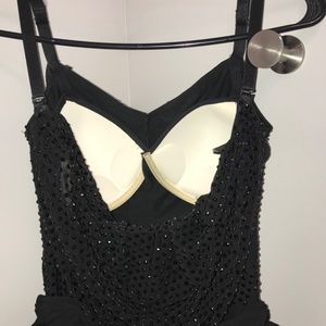 NEW Sporty black latin/rhythm ballroom dance or skating competition dress. Similar to one worn in 1st photo (actual dress in subsequent photos). Covered with black rhinestones. Low back with mid-strap. Length is short/upper thigh. Ht 5'3"-5'5"