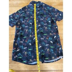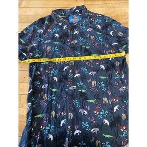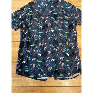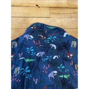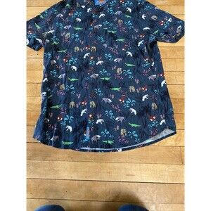 Introducing a stylish and fun addition to your wardrobe with this Balls Beachware mens button-up Hawaiian shirt. Perfect for any casual occasion, this shirt features a playful animal print with sunglasses on a greyish blue background. The short-sleeved shirt comes in size large and is made from high-quality materials for comfortable wear.