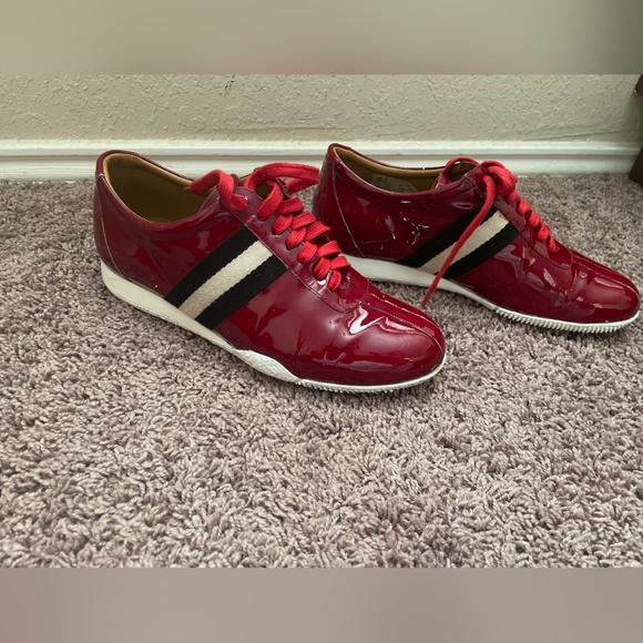 Red patent leather sneakers feature a striped pattern, and a lace-up closure for a secure and comfortable fit. Perfect for any season, these sneakers can be dressed up or down...Next day ship.