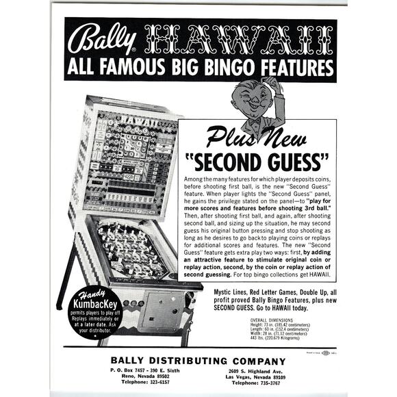 Bally Hawaii Pinball Machine Vintage Arcade Game Bingo Flyer Advertising Sheet