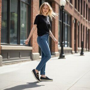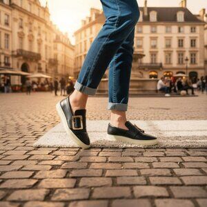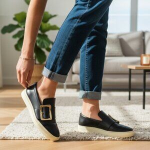 Bally Heska Black Leather Large gold Buckle Accent Slip On Sneakers Size 5.5