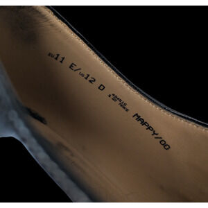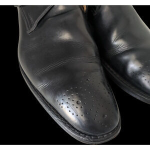 Condition: AS IS - needs to be resoled, small hole in bottom of left shoe, scuffs to leather throughout, scratch in leather on top of left shoe, see all photos