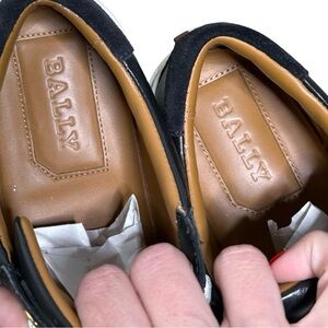 Add sleek European edge to your lineup—these Bally sneakers bring premium style with every step. Crafted from smooth black leather and suede, they feature Bally’s signature burgundy and cream side stripe and luxe tan leather insoles. Timeless, durable, and sharp.