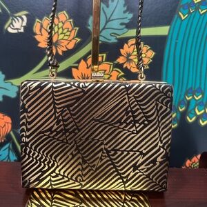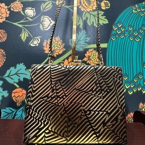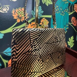 A rare vintage gem from Bally, this structured top-handle bag features a striking black-and-gold abstract pattern on a sleek box silhouette. Designed with a sturdy gold-tone metal frame and coordinating printed strap, this piece is a bold nod to the geometric fashion era of the 1980s. Whether used as a shoulder bag or a statement clutch, it’s a conversation piece and a collectible for lovers of vintage designer flair.