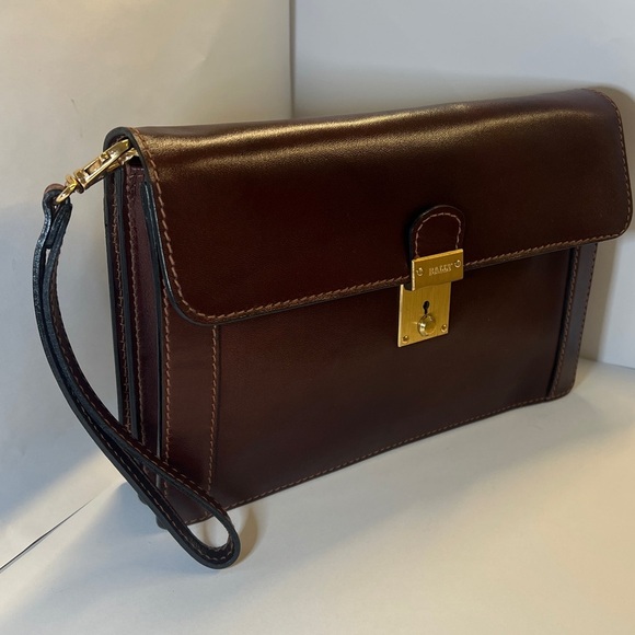 This is a beautiful Bally Vintage Smooth Dark Brown Leather Stuctured Large Wristlet Clutch Bag. Will come with key and detachable 6” opening wristlet original to the bag. Tongue and groove goldtone closure works perfectly. Double fully suede lined compartments. Wall zipper pocket. Super minor interior scuffs, no signs of wear. Excellent outside condition. Unisex, but originally made for men. No odors. No tears. 10” x 6.75” x 2”. Made in Italy