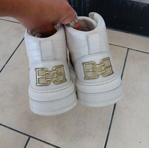 Chic high-top sneakers with croc-embossed texture. Red stripes add bold contrast. Gold details enhance style.
