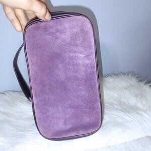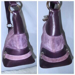 Very unique purple suede Bally bag with leather trim and silvertone hardware. Excellent preloved condition, no major callouts.