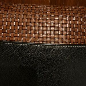 Brown woven leather front flap backside is thick black pebbled leather same as Body of Bag