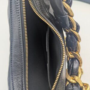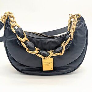 Black ‘1945 Small’ hobo bag from Balmain. Crafted from lamb leather with a shiny finish and vintage effect. Fastened with a zip, this model features a metal snap closure with a logo, flap pocket with a metal snap fastening with a logo, shoulder chain interlaced with leather, detachable shoulder strap, gold-tone metal hardware and one internal compartment with one card slot.